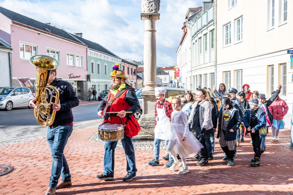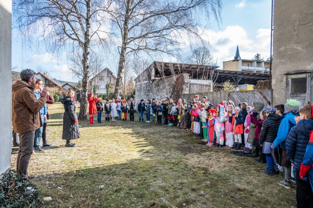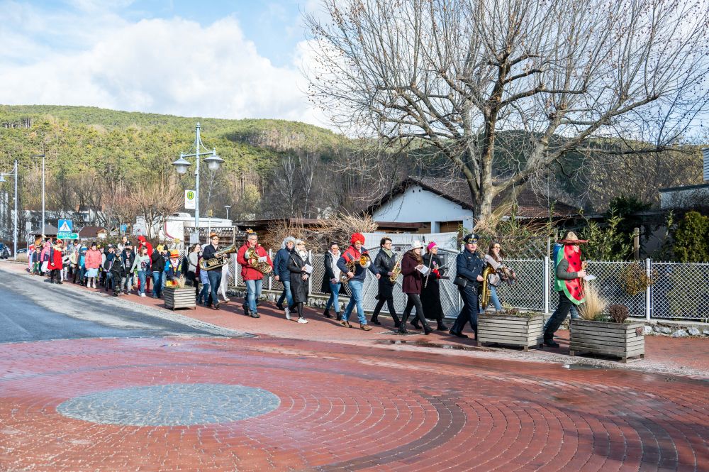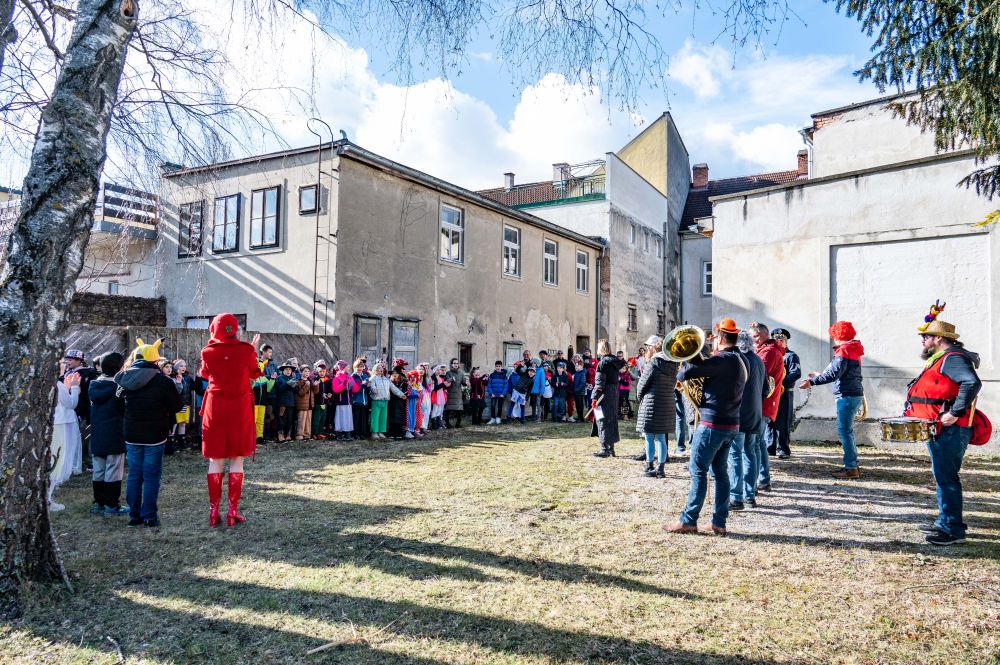 Retour ging es über die Mittelschule, wo sämtliche Schüler und Lehrer uns schon am Herbert Seiser-Platz erwarteten. Bei allen Stationen haben die Kinder ihr Faschingslied gesungen und hatten jede Menge Spaß beim kleinen Faschingsumzug.