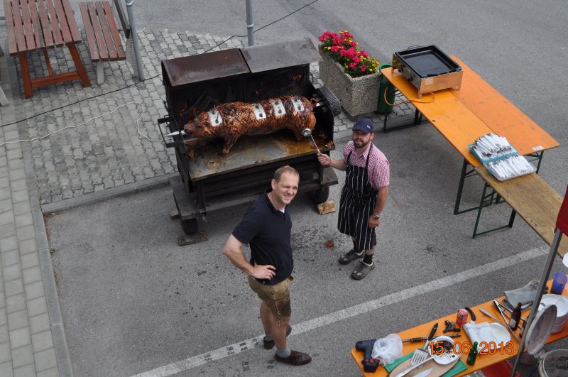 | Schon um 4.00 Uhr morgens des 15. Juni begannen die Arbeiten für Martin Hayden und Manfred Schmied, die beide für den kulinarischen Teil des Tages sorgten. Ein Spanferkel sollte bis Mittag „essfertig“ sein und musste rechtzeitig auf den Spieß. Die Zeit war gut eingeteilt und so freuten sich die Gäste pünktlich zur Mittagszeit über knuspriges Spanferkel vom Grill. Für die Grillmeister erntete es jede Menge Lob und so mancher langte nicht nur einmal zu! | ![]() |